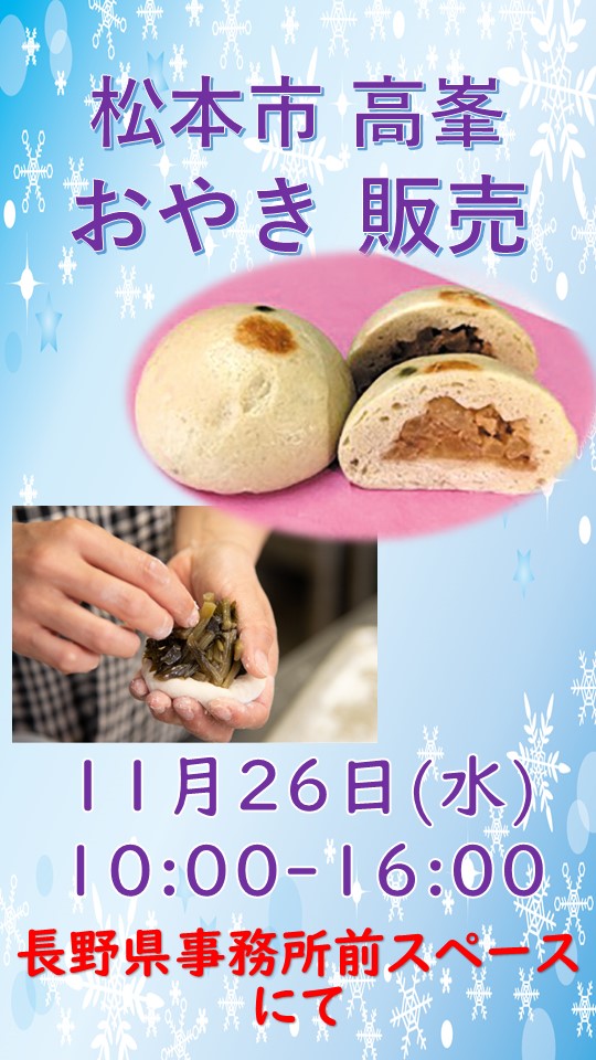 2025.11.26 【長野県】松本市高峯 おやき販売 2025年11月26日(水) 10:00~16:00 信州松本の自然が育んだ優しい風土食 日時 2025年11月26日(水) 10:00~16:00 会場 長野県事務所前スペースにて