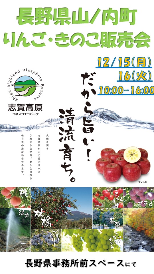 2025.12.15 【長野県】長野県山ノ内町 りんご・きのこ販売会2025年12月15日(月)~16日(火) 10:00~16:00 日時 2025年12月15日(月)~16日(火) 10:00~16:00 会場 長野県事務所前スペース