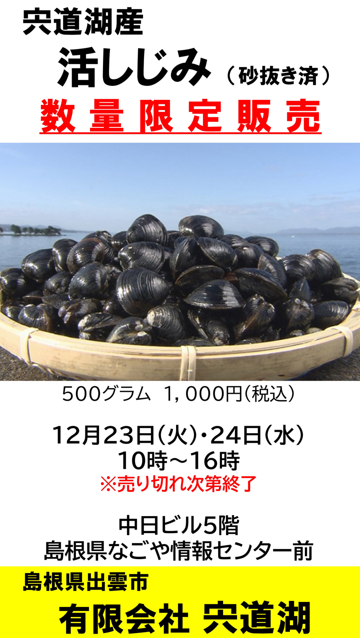 本イベントは終了しました。 2025.12.23 【島根県】宍道湖産 活しじみ(砂抜き済)数量限定販売2025年12月23日(火)・12月24日(水)10時~16時 売り切れ次第終了 開催日時 2025年12月23日(火)・12月24日(水)10:00~16:00 売り切れ次第終了 場所 中日ビル5階 島根県なごや情報センター前 販売 宍道湖産 活しじみ(砂抜き済) 500グラム 1,000円(税込) 島根県出雲市 有限会社 宍道湖