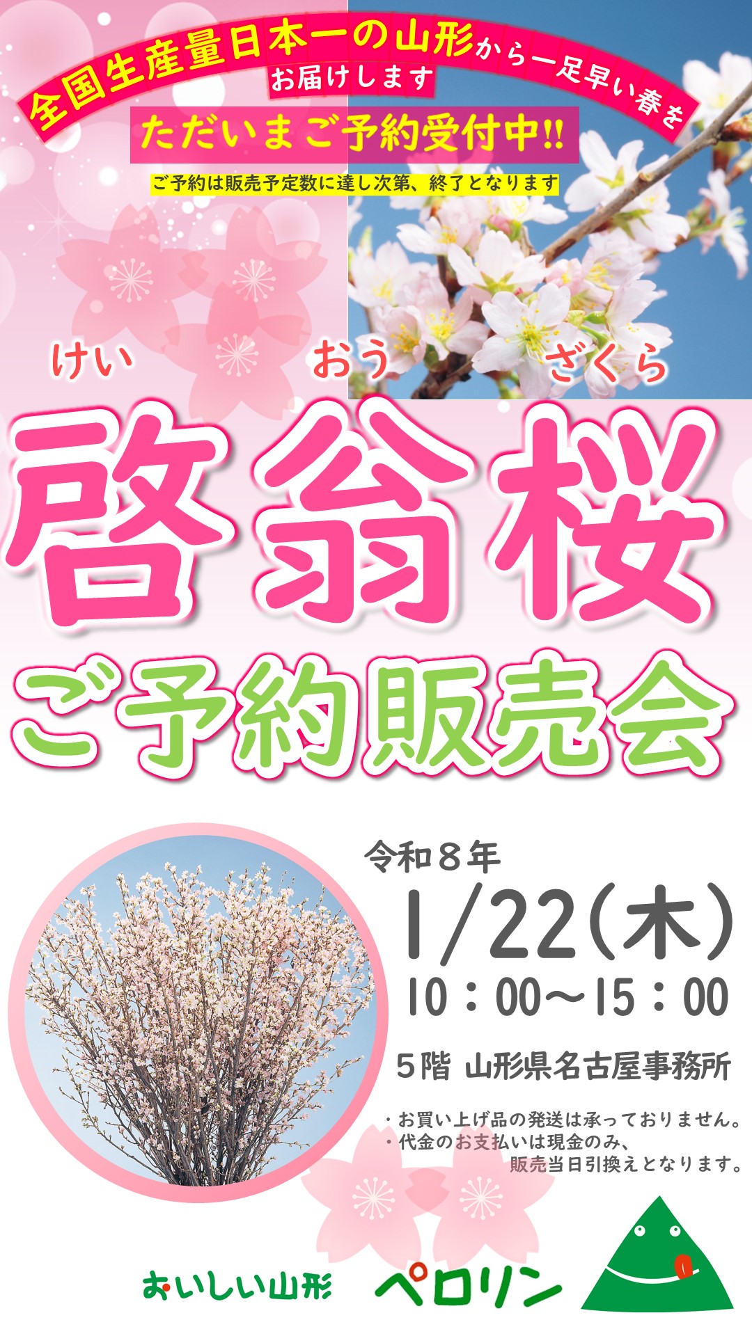 2026.1.22 【山形県】啓翁桜ご予約販売会[ただいまご予約受付中!!]2026年1月22日(木)10:00~15:00 全国生産量日本一の山形から一足早い春をお届けします ご予約は販売予定数に達し次第、終了となります 販売日 2026年1月22日(木)10時~15時 場所 中日ビル5階 山形県名古屋事務所 ・お買い上げ品の発送は承っておりません。・代金のお支払いは現金のみ、販売当日引換えとなります。