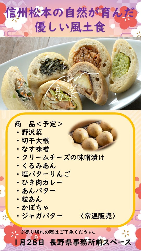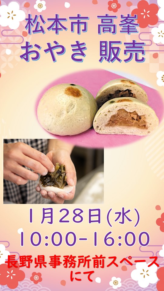 2026.01.28 【長野県】松本市高峯 おやき販売 2026年1月28日(水) 10:00~16:00 信州松本の自然が育んだ優しい風土食 日時 2026年1月28日(水) 10:00~16:00 会場 長野県事務所前スペースにて