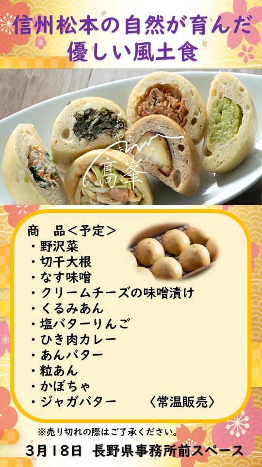 2026.03.18 【長野県】松本市高峯 おやき販売 2026年3月18日(水) 10:00~16:00 信州松本の自然が育んだ優しい風土食 日時 2026年3月18日(水) 10:00~16:00 会場 長野県事務所前スペースにて