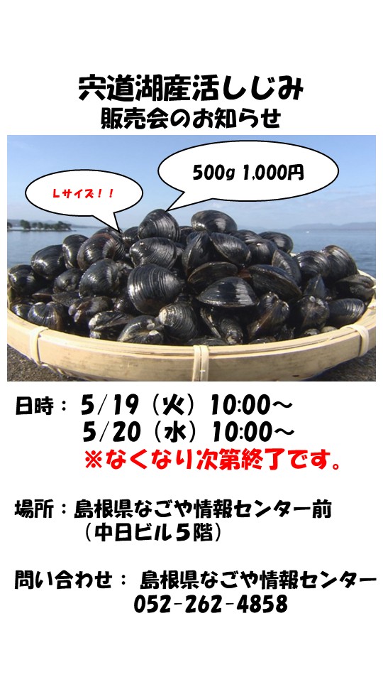 2026.05.19 【島根県】宍道湖産活しじみ 販売会のお知らせ2026年5月19日(火)10:00~・5月20日(水)10:00~ ※なくなり次第終了です。 開催日時 2026年5月19日(火)10:00~・5月20日(水)10:00~ ※なくなり次第終了 場所 中日ビル5階 島根県なごや情報センター前 販売 宍道湖産活しじみ Lサイズ 500グラム 1,000円(税込) 問い合わせ:島根県なごや情報センター 052-262-4852