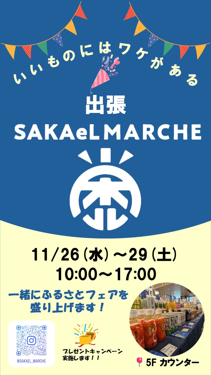 2025.11.26 出張SAKAeLMARCHE(2F SAKAeLMARCHE)2025.11.26(水)~11.29(土) 10:00~17:00 いいものにはワケがある プレゼントキャンペーン実施!!一緒にふるさとフェアを盛り上げます! 日時 2025.11.26(水)~11.29(土) 10:00~17:00 会場 5F カウンター