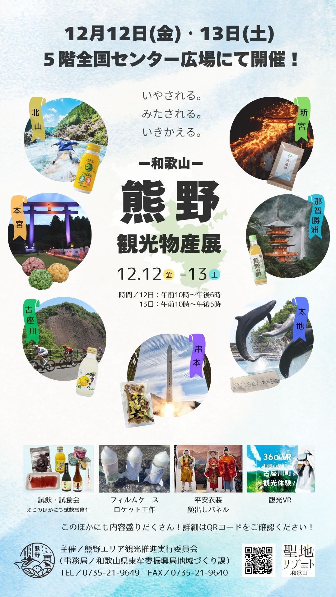 2025.12.12 【和歌山県】熊野観光物産展2025.12.12(金)~12.13(土) 10:00~18:00[13日は17:00まで] いやされる。 みたされる。 いきかえる。 日時 2025.12.12(金)~12.13(土)10:00~18:00[13日は17:00まで] 会場 中日ビル5F 全国センター広場 主催:熊野エリア観光推進実行委員会(事務局/和歌山県東牟婁振興局地域づくり課)TEL/0735-21-9649 FAX/0735-21-9640