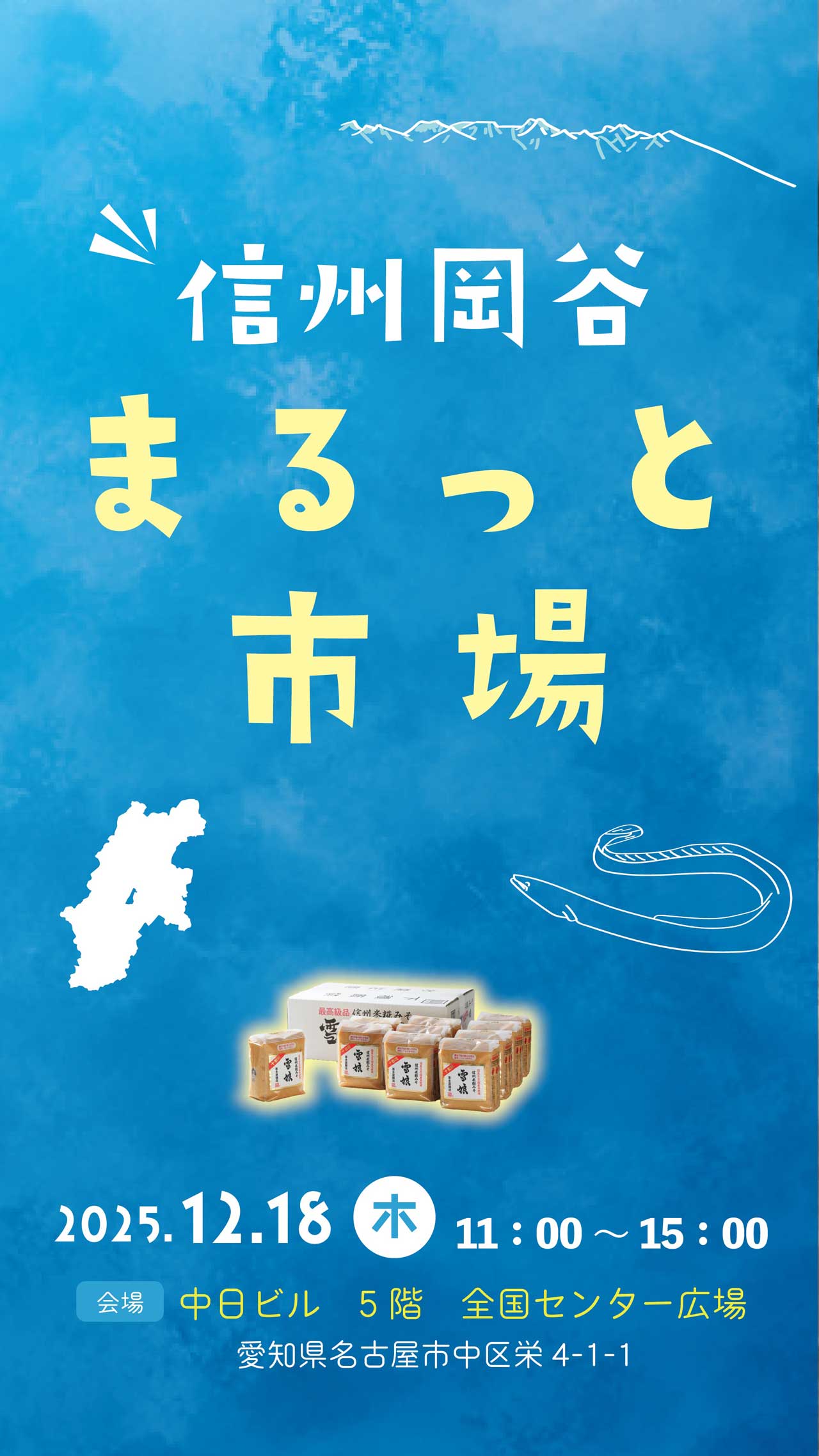 2025.12.18 【長野県】信州岡谷 まるっと市場 2025.12.18(木) 11:00~15:00 開催日時 2025.12.18(木)11:00~15:00 開催場所 中日ビル 5階 全国センター広場