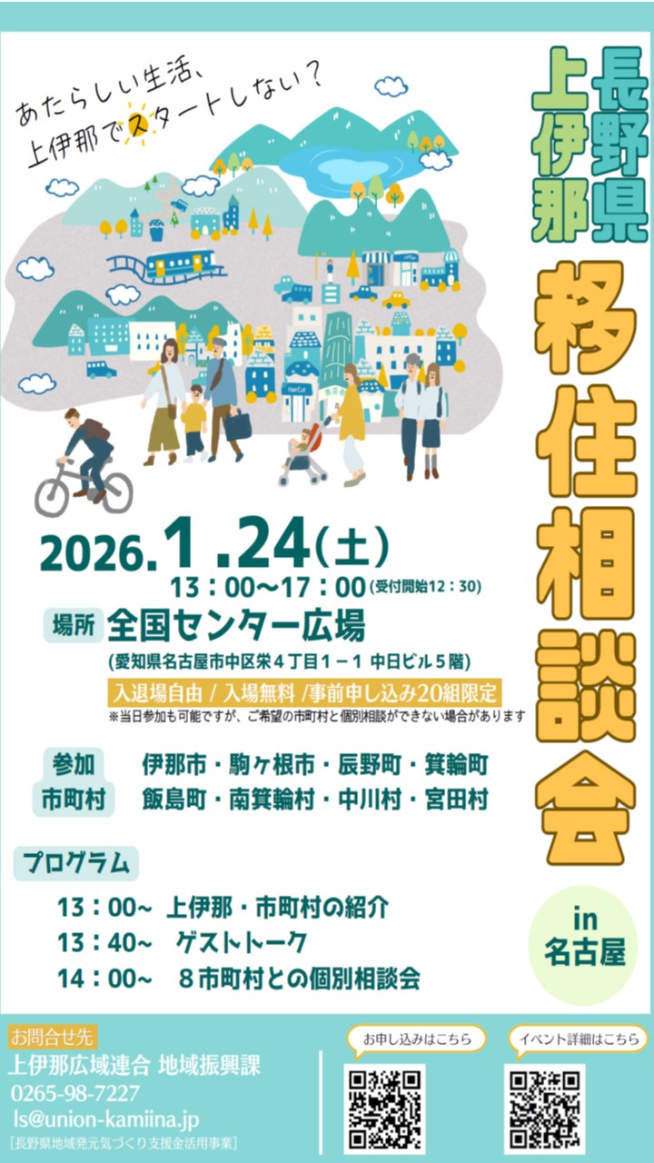 2026.01.24 長野県上伊那 移住相談会in名古屋2026.01.24(土) 13:00~17:00[受付開始 12:30] あたらしい生活、上伊那でスタートしない? プログラム 13:00~ 上伊那・市町村の紹介 13:40~ ゲストトーク 14:00~ 8市町村との個別相談会 日時 2026.01.24(土) 13:00~17:00[受付開始 12:30] 会場 中日ビル5階 全国センター広場 参加市町村 伊那市・駒ケ根市・辰野町・箕輪町・飯島町・南箕輪村・中川村・宮田村 お問合せ先 上伊那広域連合 地域振興課 0265-98-7227 ls@union-kamiina.jp