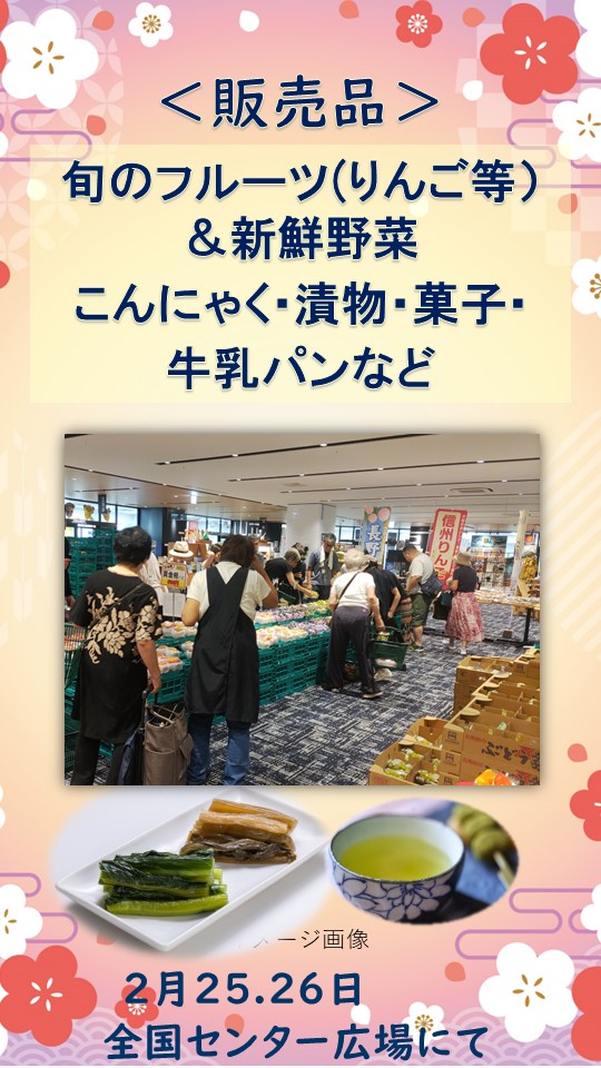 | 販売品 | 旬のフルーツ(りんご等)&新鮮野菜・こんにゃく・漬物・菓子・牛乳パン など |