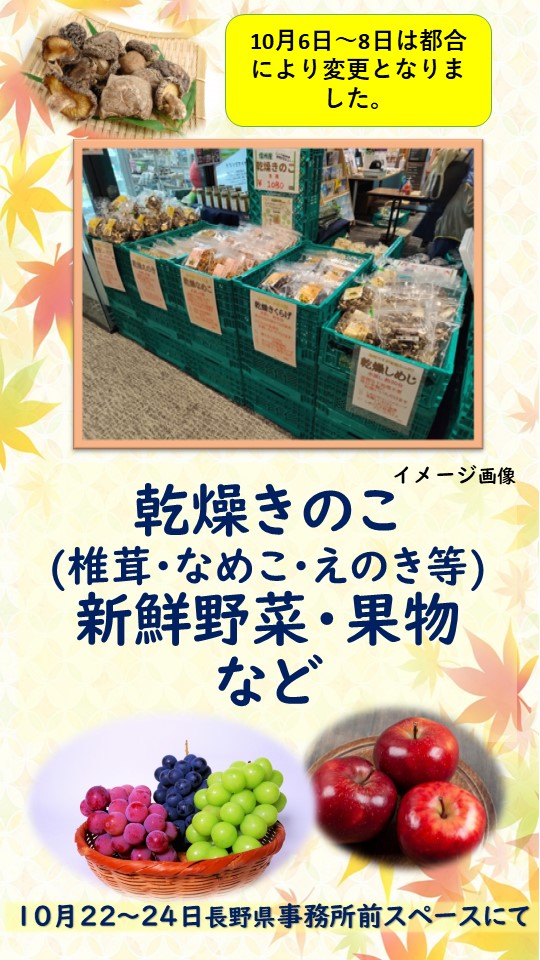 販売品 | 乾燥きのこ(椎茸・なめこ・えのき等)、新鮮野菜・果物など |