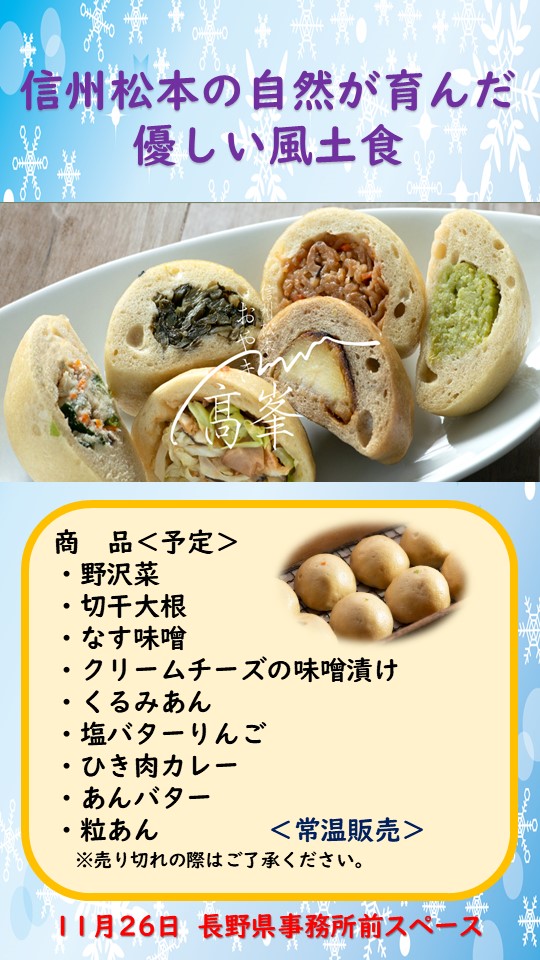 2025.11.26 【長野県】松本市高峯 おやき販売 2025年11月26日(水) 10:00~16:00 信州松本の自然が育んだ優しい風土食 日時 2025年11月26日(水) 10:00~16:00 会場 長野県事務所前スペースにて