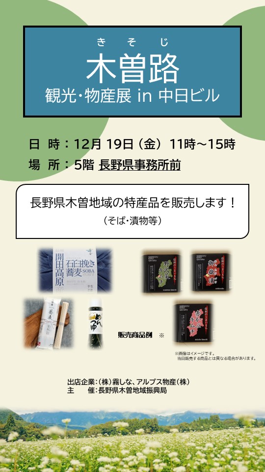 2025.12.19 【長野県】木曽路観光・物産展in中日ビル2025年12月19日(金)11:00~15:00 長野県木曽地域の特産品を販売します! (そば・漬物等) 開催日時 2025年12月19日(金)11:00~15:00 出店企業 (株)霧しな、アルプス物産(株) 主催:長野県木曽地域振興局