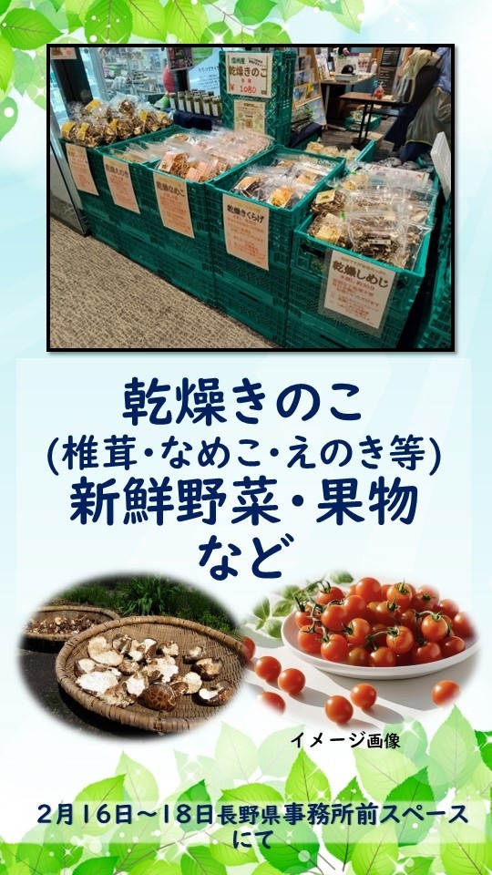 | 販売品 | 乾燥きのこ(椎茸・なめこ・えのき等)、新鮮野菜・果物など |
