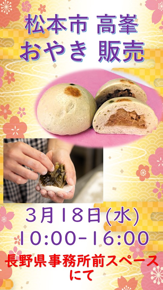 2026.03.18 【長野県】松本市高峯 おやき販売 2026年3月18日(水) 10:00~16:00 信州松本の自然が育んだ優しい風土食 日時 2026年3月18日(水) 10:00~16:00 会場 長野県事務所前スペースにて