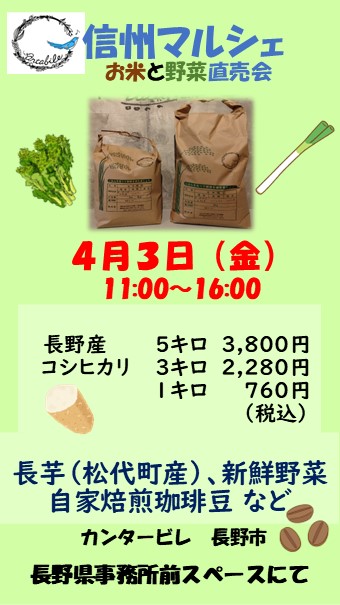 2026.04.03 【長野県】信州マルシェ 2026年4月3日(金)11:00~16:00 信州マルシェ お米と野菜直売会 日時 2026年4月3日(金)11:00~16:00 場所 長野県事務所前スペースにて 内容 <長野県産コシヒカリ>5キロ 3,800円 / 3キロ 2,280円 / 1キロ 760円 (税込) 長芋(松代町産)、新鮮野菜、自家焙煎珈琲豆 など カンタービレ 長野市