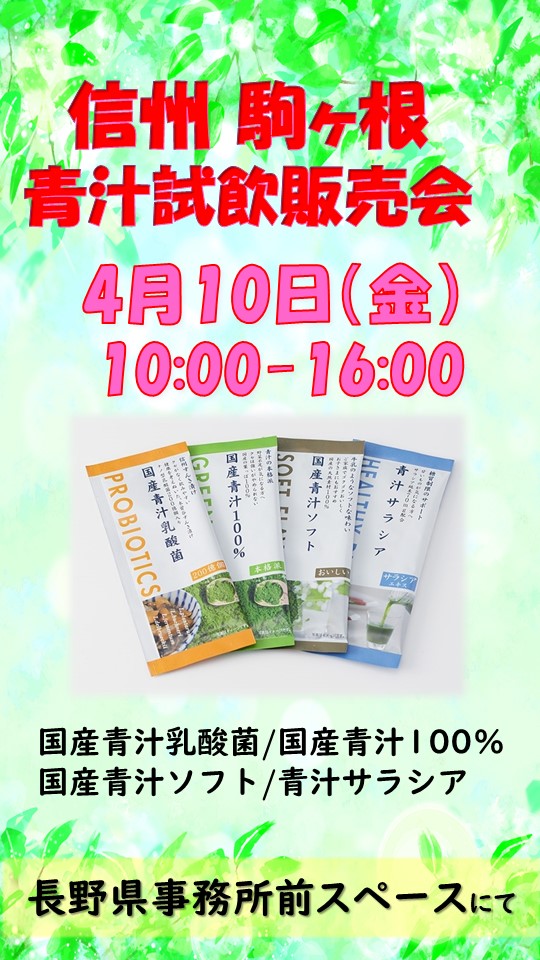 2026.04.10 【長野県】信州駒ケ根 青汁試飲販売会 2026.04.10 10:00~16:00 健康が気になるあなたに! 日時 2026年4月10日(金) 10:00~16:00 会場 長野県事務所前スペースにて 内容 国産青汁乳酸菌/国産青汁100%/国産青汁ソフト/青汁サラシア
