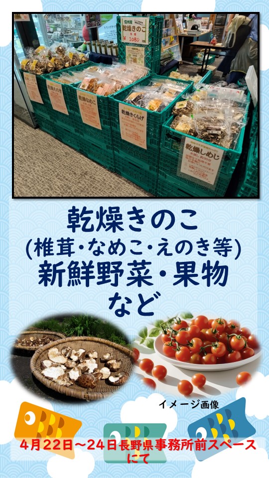 | 販売品 | 乾燥きのこ(椎茸・なめこ・えのき等)、新鮮野菜・果物など |