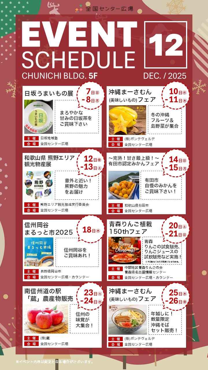 2025.11.27 全国センター広場2025年12月度 イベント 2025年12月イベント案内 PDFファイル 2025年12月 EVENT SCHEDULE - CHUNICHI BLDG.(2.00MB)