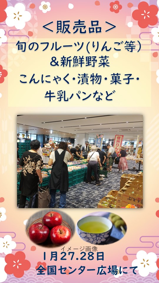 | 販売品 | 旬のフルーツ(りんご等)&新鮮野菜・こんにゃく・漬物・菓子・牛乳パン など |
