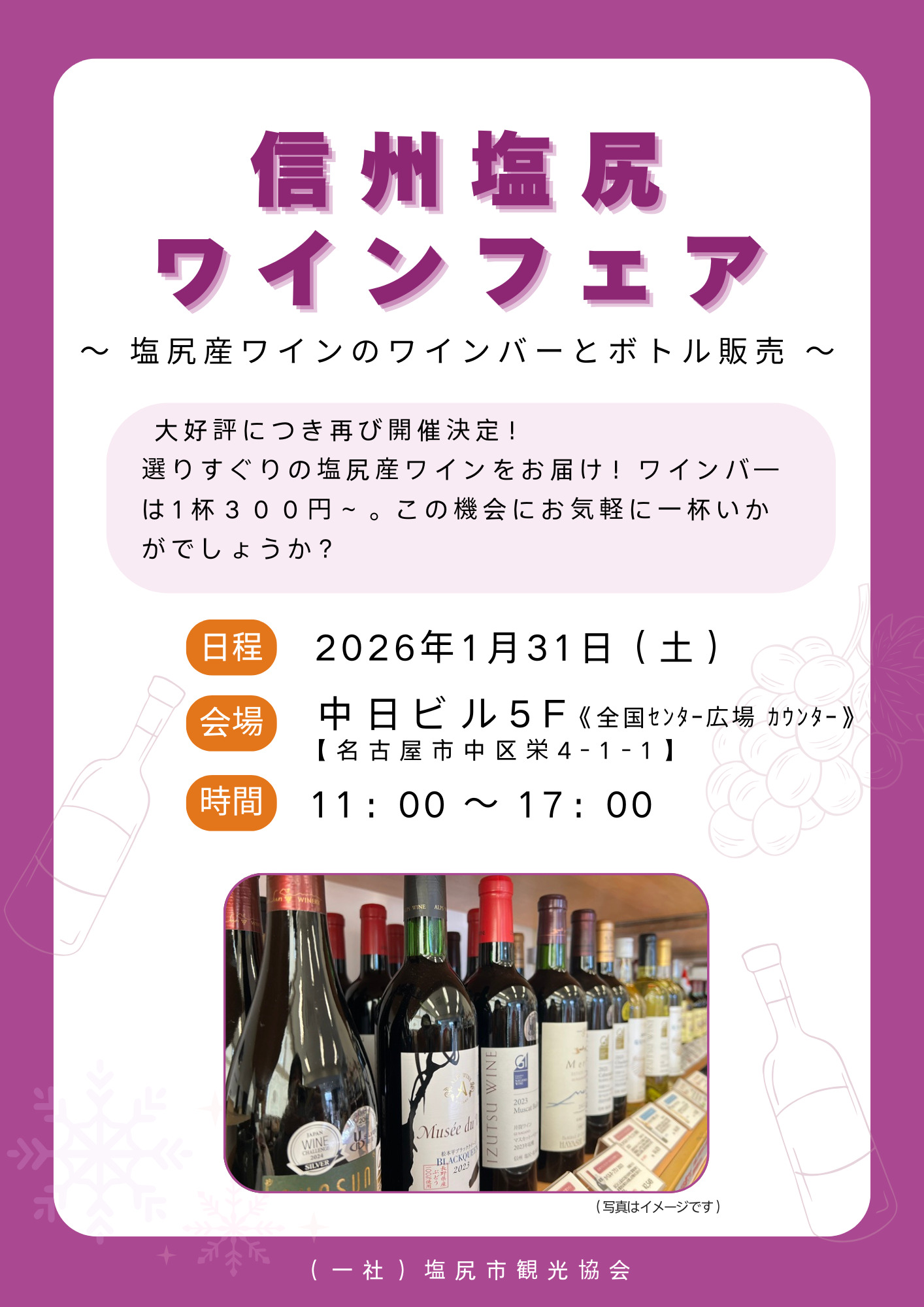 2026.01.31 【長野県】信州塩尻 ワインフェア 2026年1月31日(土) 11:00~17:00 ~塩尻ワインのワインバーとボトル販売~ 大好評につき再び開催決定! 選りすぐりの塩尻産ワインをお届け!ワインバーは1杯300円から。この機会にお気軽に 一杯いかがでしょうか? 日時 2026年1月31日(土) 11:00~17:00 会場 中日ビル5F<全国センター広場 カウンター> 名古屋市中区栄4-1-1 (一社)塩尻市観光協会