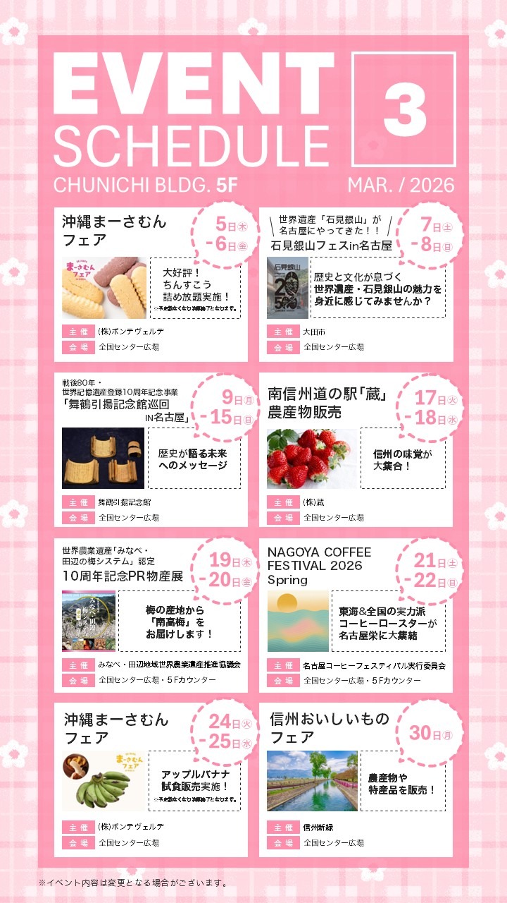 2026.2.26 全国センター広場2026年3月度 イベント 2026年3月イベント案内 PDFファイル 2026年3月 EVENT SCHEDULE - CHUNICHI BLDG.(1.00MB)